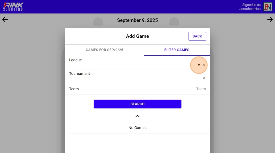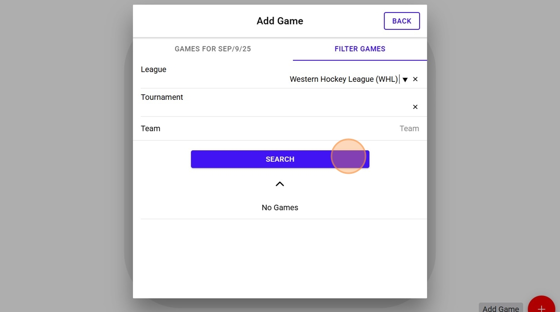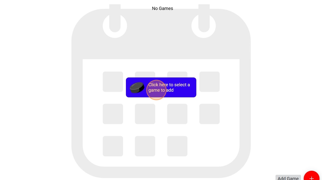 1. Click "Click here to select a game to add" to add games for the current day. You can navigate between days using the arrows at the top of the screen to search for games.