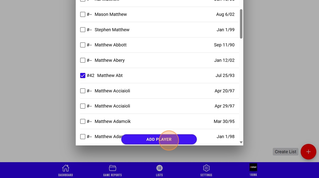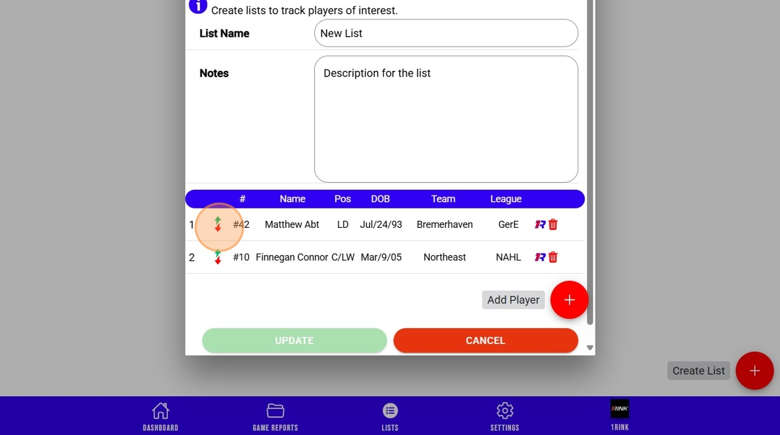 Create player lists to help manage and keep track of players in different categories, along with rankings and 1Rink profiles and stats.