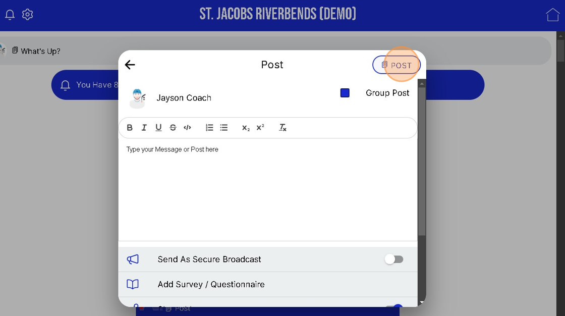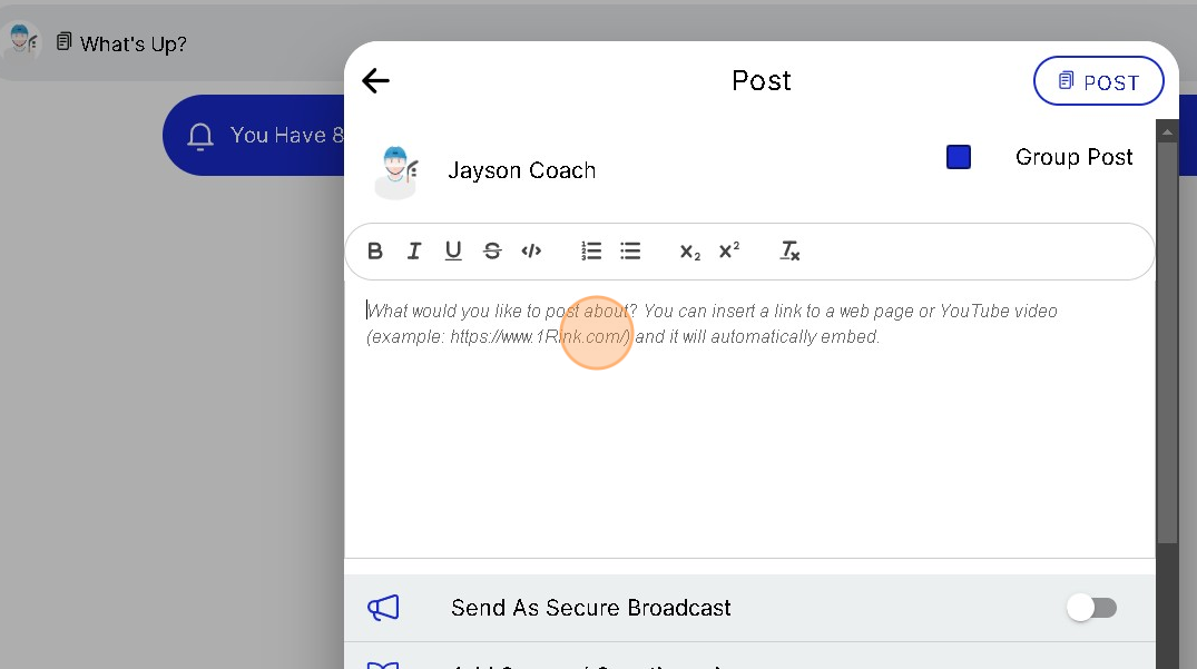 1. You can create a post or Secure Broadcast by pressing the “+” found in the bottom right corner of your screen. 2. You can also opt to switch between a standard post or a Secure Broadcasts by using the “Send a Secure Broadcast” toggle when creating ...