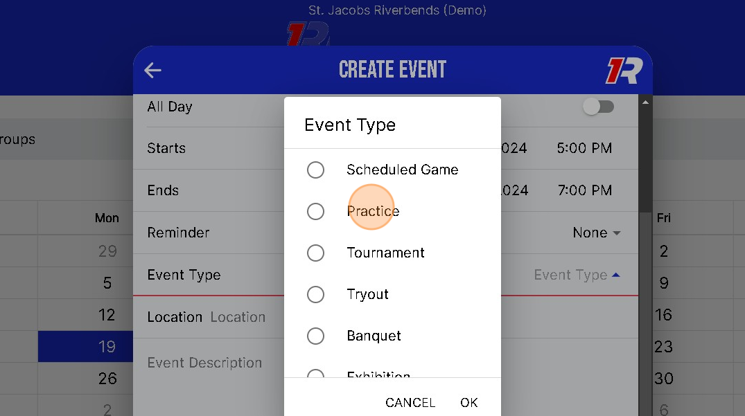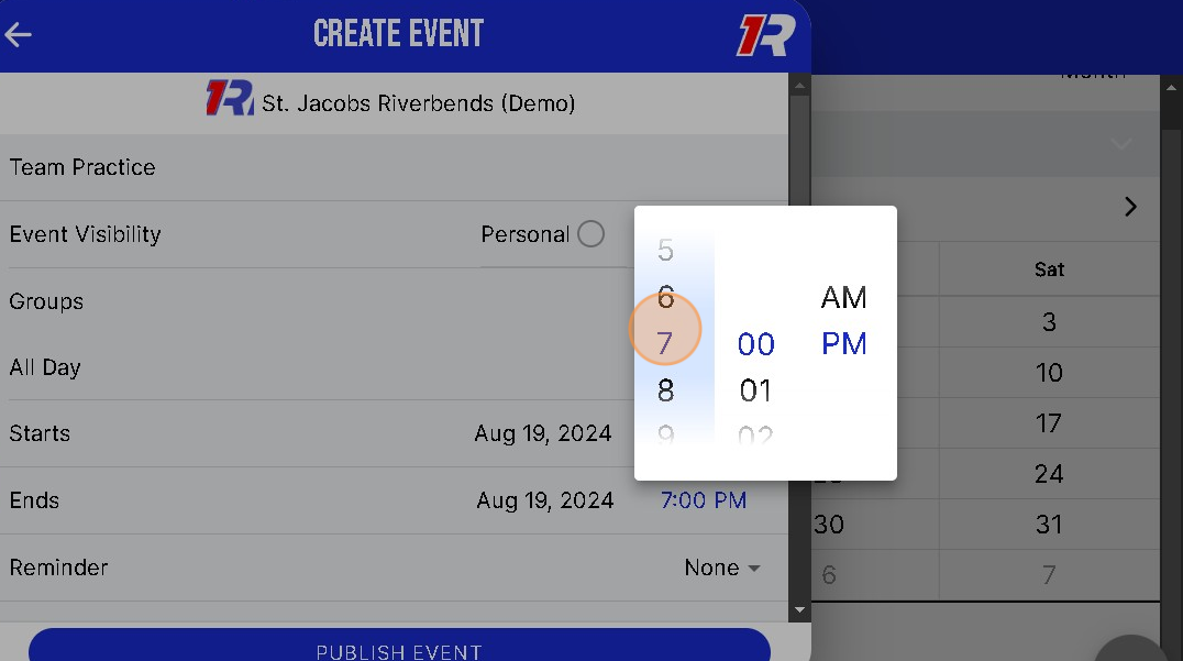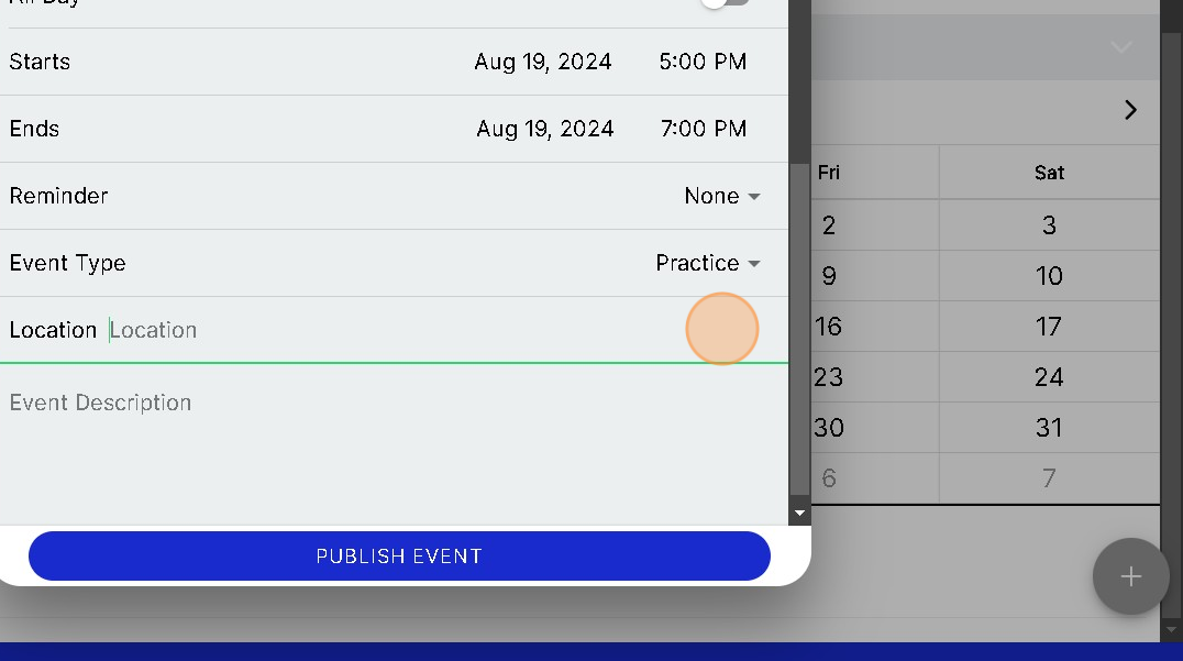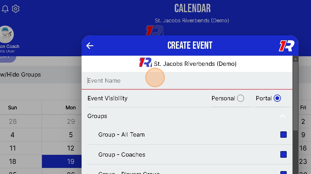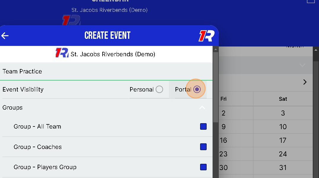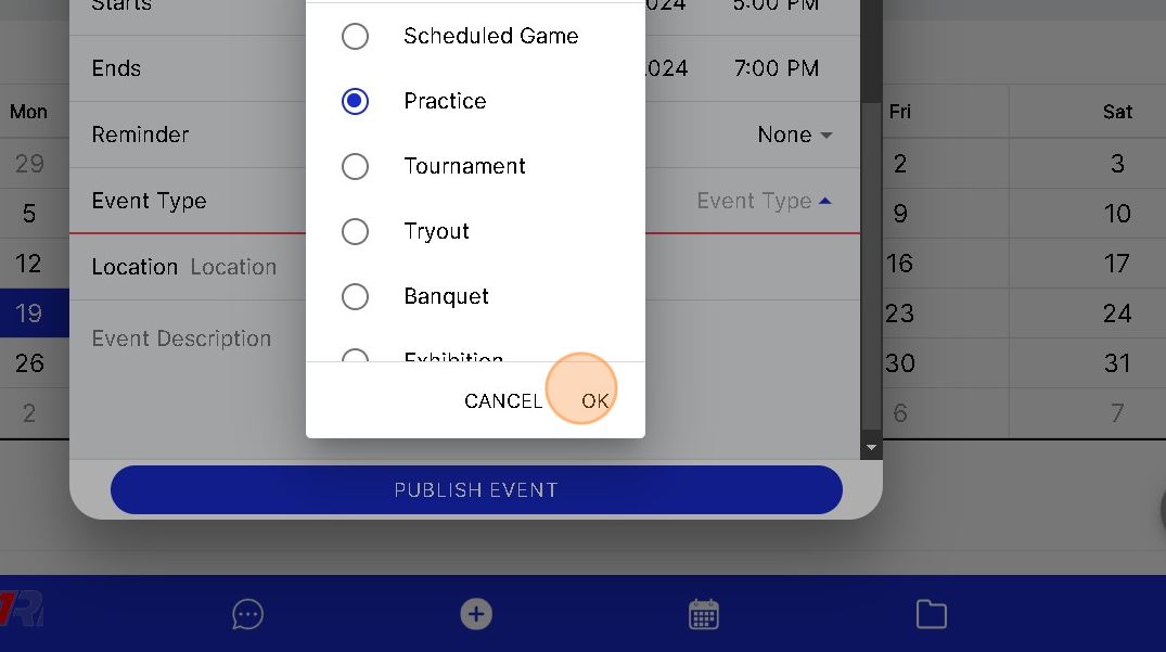 - Creating and Publishing a Practice/ Event- 1. Click the calendar icon at the bottom. 2. Click the date where you want to create an event. 3. Click "Add Event". 4. Click and add the "Event Name". 5. Type "P [[CapsLock]] ractice" 6. Click "Personal" or if it is for everyone in the "Portal". 7. ...